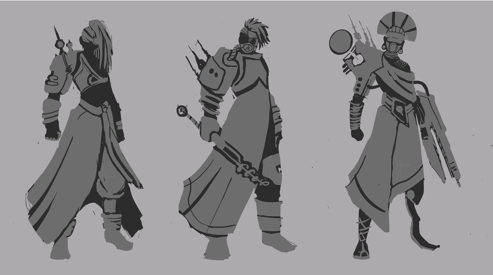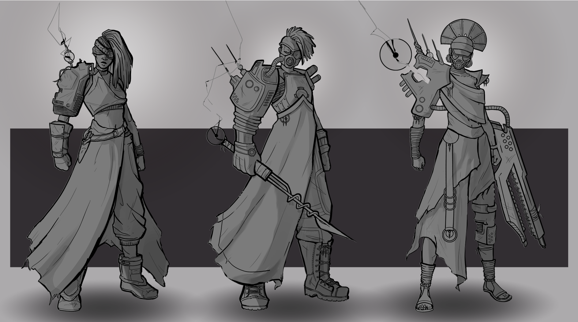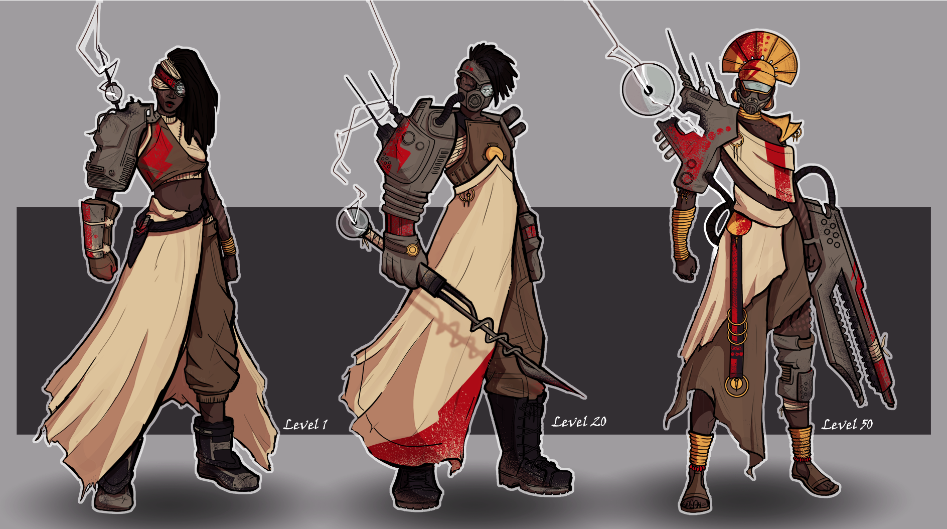 This was a personal project to explore two different styles of art for the genre. The first is a main character progression through the levels of a video game set in a Wasteland in Africa, where the only remaining energy is harvested from lighting storms.