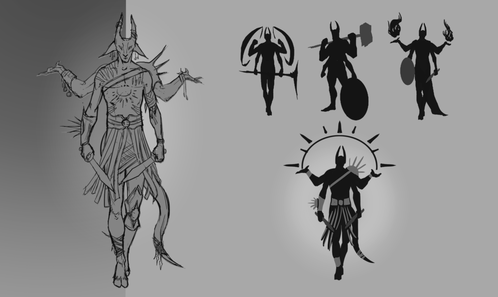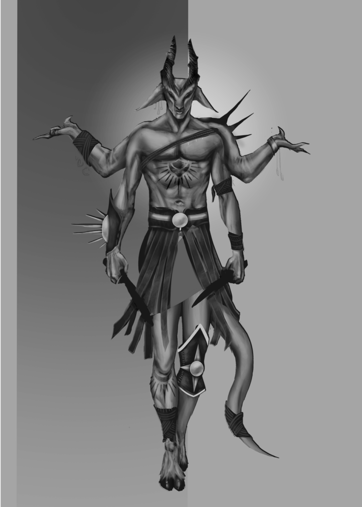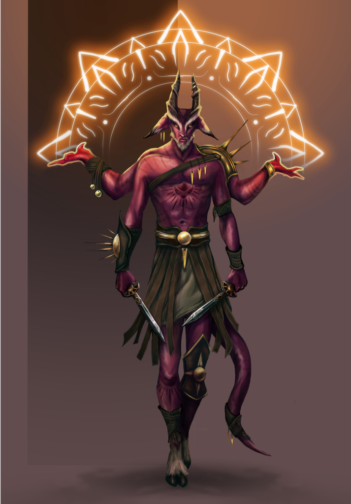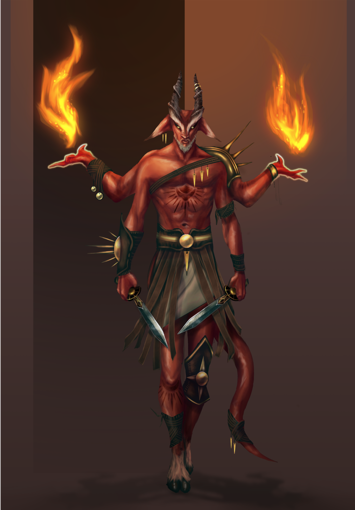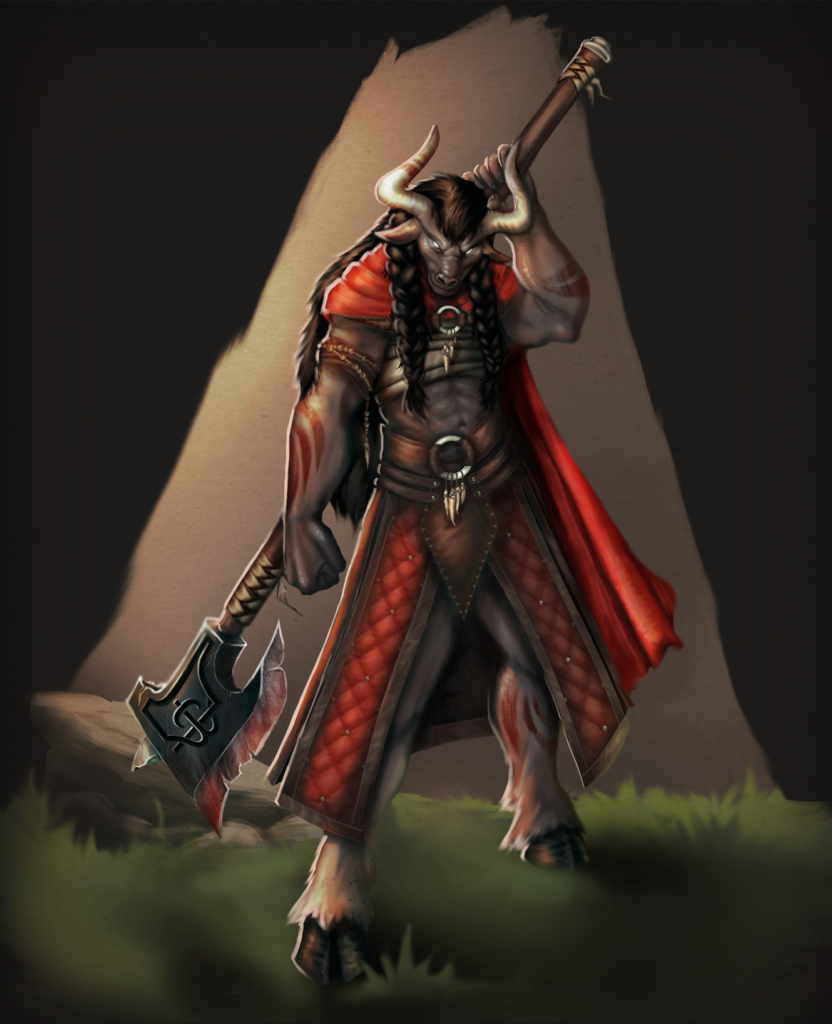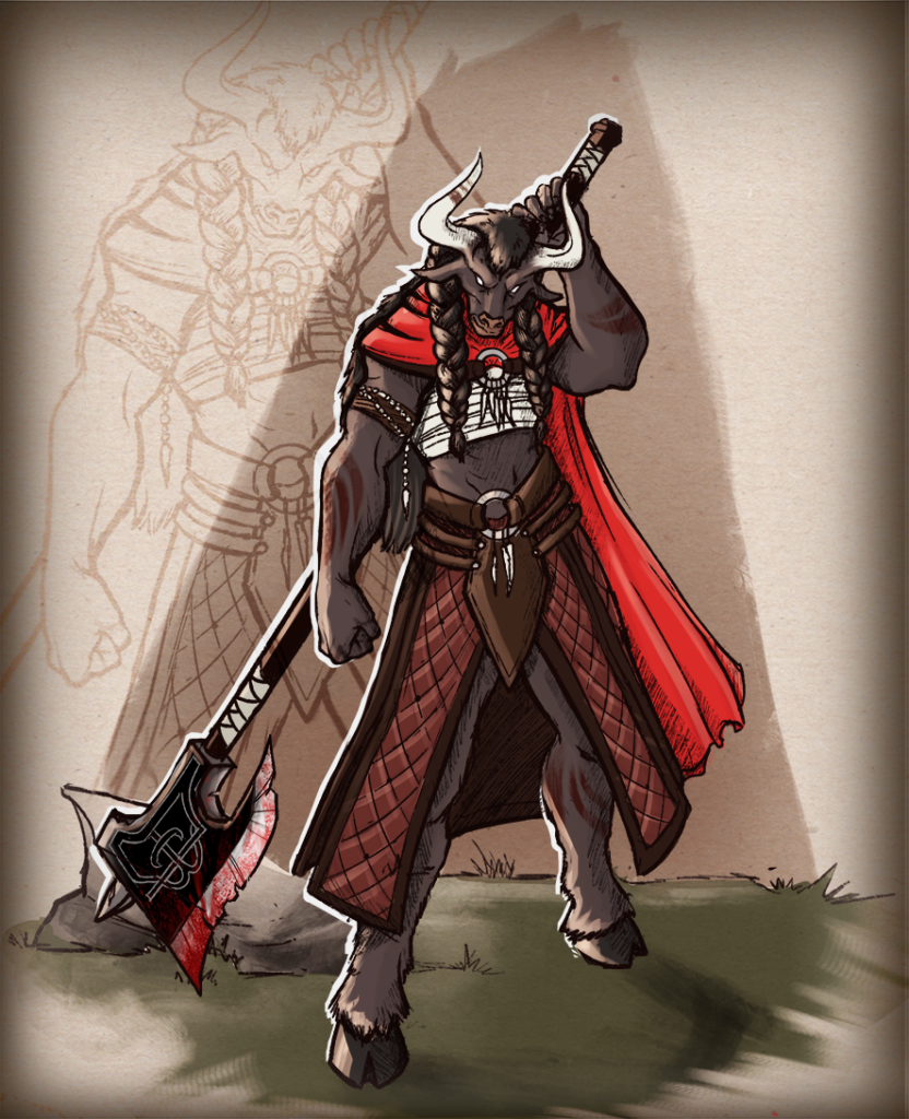 The Minotaur represents a barbarian class archetype, with a pike-sized axe and a red bullfighting cape as a cloak; while the Holy Spartan character occupies a more magical and godly figure: with two sets of arms, goat-like features and spartan inspired dressing with Sun motifs.